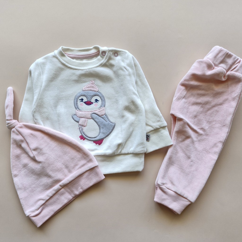 ست کلاهدار پاییزه مخمل پنگوئن صورتی وچیون