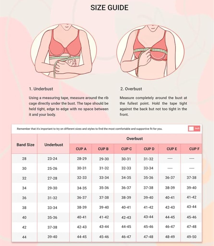 مطابق با تصویر سمت چپ جدول سایز، ابتدا دور تا دور قسمت زیر سینه خود را اندازه گیری کرده و عدد به دست آمده را بر 2.54 تقسیم کنید تا به اینچ تبدیل شود. این عدد مربوط به ستون دوم از سمت چپ است و با توجه به آن، عدد سایز از ستون اول سمت چپ مشخص می شود.